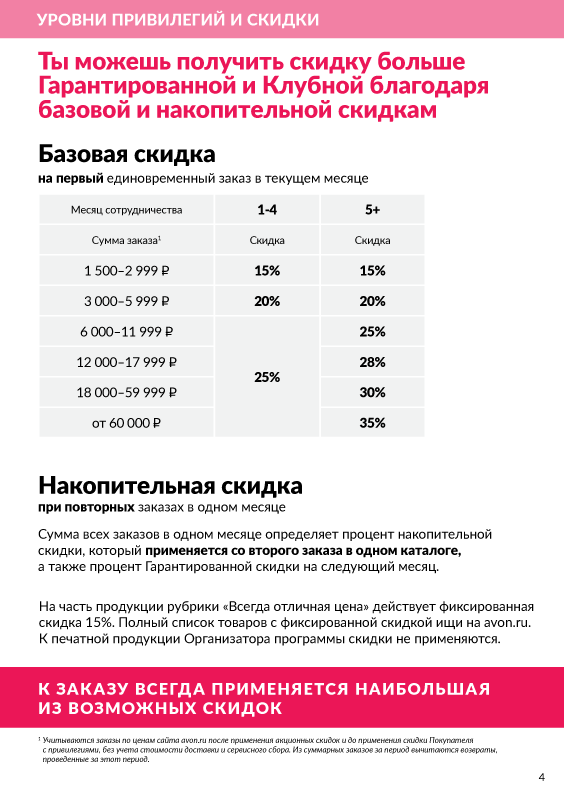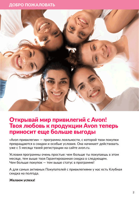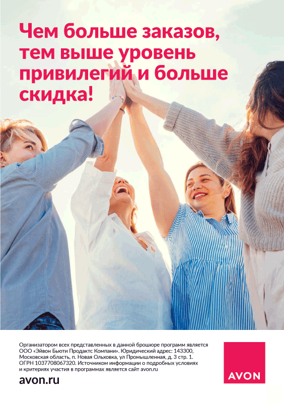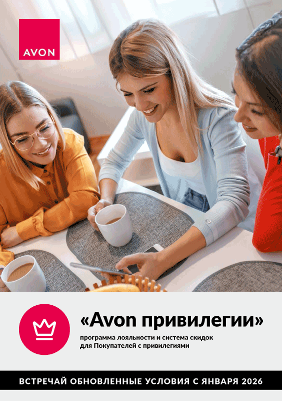 Мы представляем новую программу лояльности Avon Привилегии. Понятная и прозрачная, она дает возможность выбирать. Выбирать тот уровень Привилегий, которые ты хочешь получить. Этой программой мы хотим сказать спасибо всем, кто с нами уже много лет или только открывает для себя мир Avon. Это новый путь в наши долгосрочные отношения. Тебя ждут беспрецедентные скидки, премиальное сервисное обслуживание и персонализированные предложения. Какие именно – зависит от тебя!